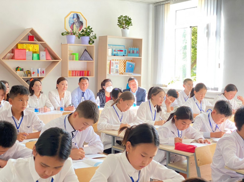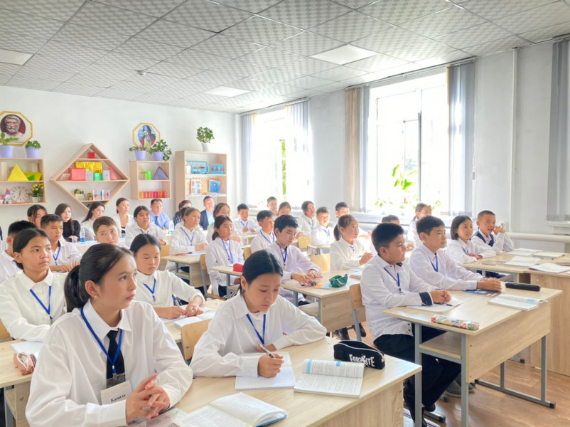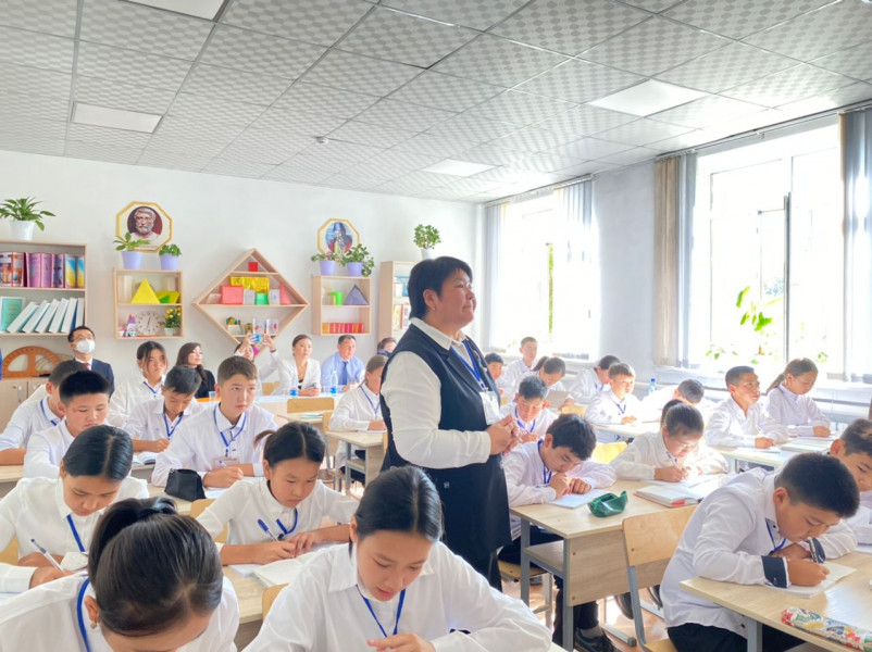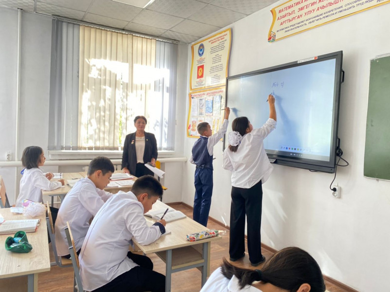 Коноктор мектеп менен таанышып, 7-А классында математика сабагынан “Сандуу туюнтмалар” деген темада өтүлгөн ачык сабакка катышып, интерактивдүү панель менен окуучулардын иштешине күбө болушту.