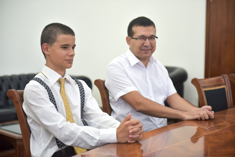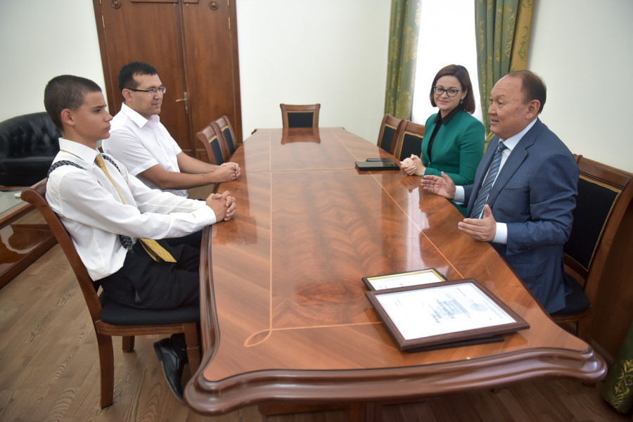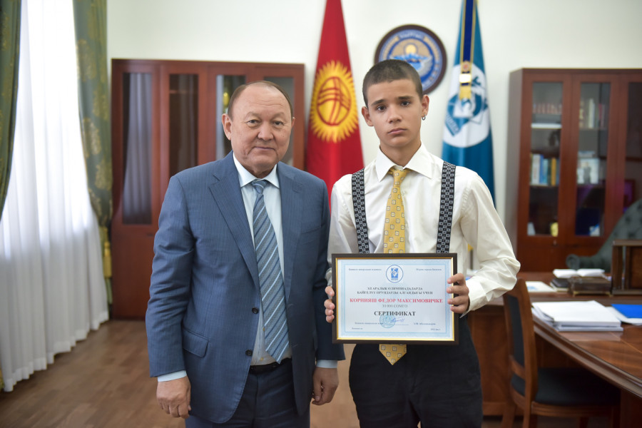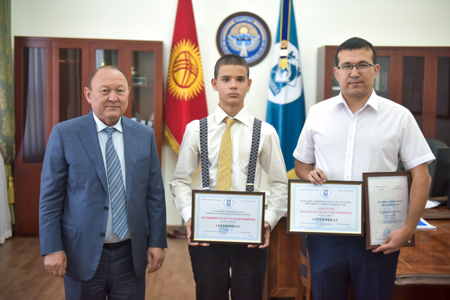 Борбордун мэри Эмилбек Абдыкадыров математика боюнча эл аралык олимпиадалардын жеңүүчүсү Федор Корнияш менен мугалим Махамадхан Ишматовго акчалай сертификаттарды тапшырды.