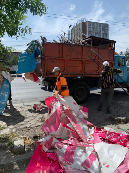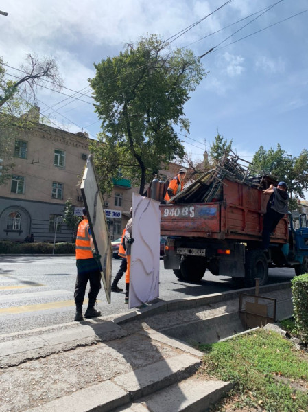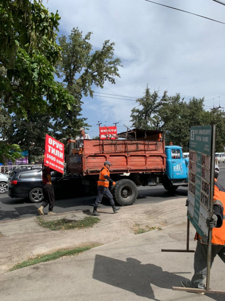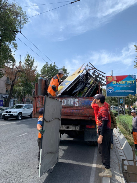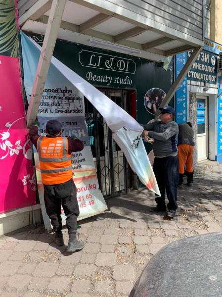 “Бишкекбашкыархитектура” муниципалдык ишканасынын, Бишкек шаарынын мэриясынын Көрктөндүрүүнү жана жер пайдаланууну контролдоо боюнча муниципалык испекциясынын, Бишкек шаарынын мэриясынын Мамлекеттик тилди өнүктүрүү бөлүмүнүн, Ленин администрациялык району боюнча Бишкек шаарынын мэриясынын муниципалдык администрациясынын, Бишкек шаарынын мэриясынын “Тазалык” муниципалдык ишканасынын кызматкерлеринен түзүлгөн жумушчу комиссиянын курамы бүгүн шаардын Дэн Сяопин/Интергельпо көчөсүнүн кесилишинен баштап Чүй/Турусбеков көчөсүнө чейин мыйзам талаптарына ылайык келбеген жана уруксатсыз илинген жарнамаларды алышты.