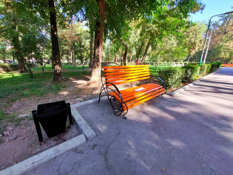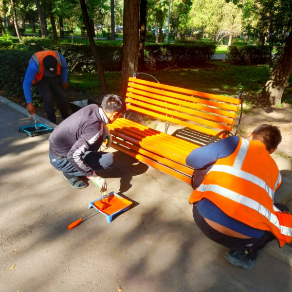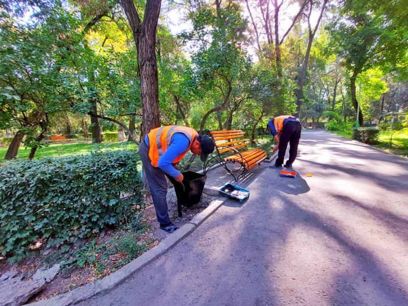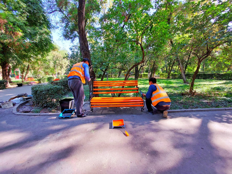 Ишкананын кызматкерлери Тоголок Молдо атындагы гүлбакчасында отургучтарды жана таштанды челектерин оңдоп, сырдап башташты. 50дөн ашык отургуч, 30 урна сырдалды. Жумушка 10 кызматкер тартылды.