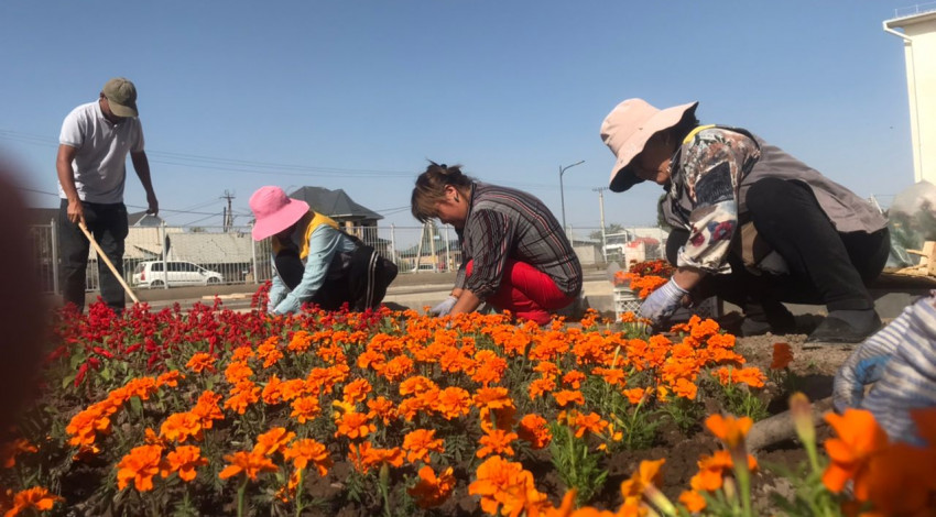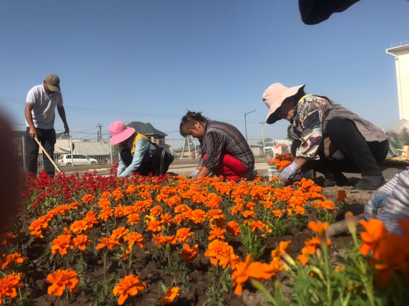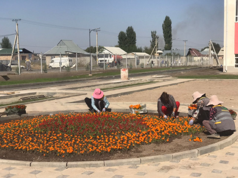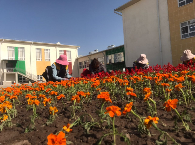 Мектептердин аймагы чөптөрдөн, таштандылардан жана отоо чөптөрдөн тазаланды. Жерди тегиздеп, газон чөптүн уруктары себилип, ийне жалбырактуу бак-дарактар отургузулуп, мектептин короосуна кызыл сальвиа, ачык күрөң тагетеси сыяктуу бир жылдык гүлдөр айкалышып, тегерек гүлзарларга отургузулду.