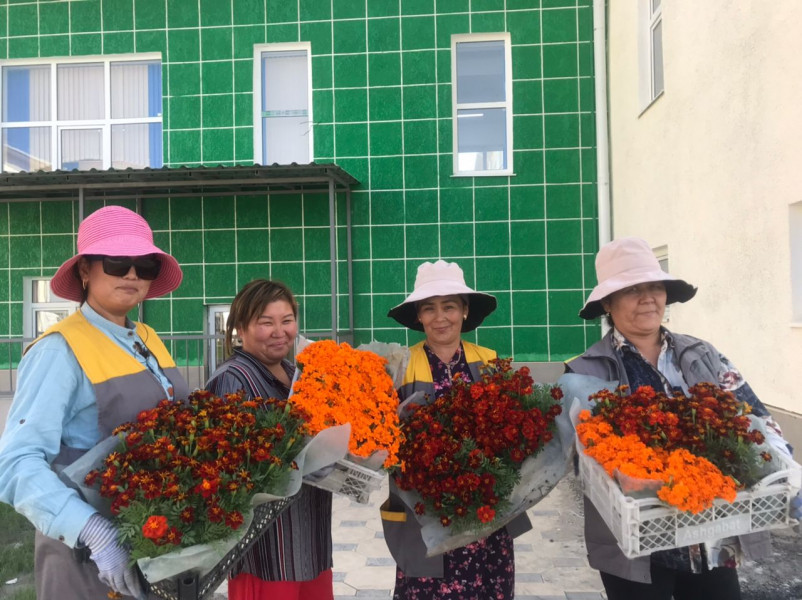 “Мурас-Ордо” жаңы конушундагы мектеп 42 арча, 1000 м2 газон чөп жана 3 миң бир жылдык гүлдөр менен кооздолгон.