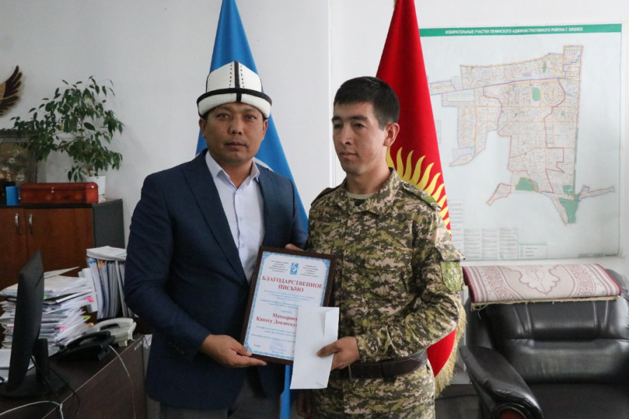 Ленин районунун Жамгырчинов көчөсүндө жайгашкан үйдөн чыккан өрттү өчүргөн №6 өрт-куткаруу бөлүмүнүн кызматкерлери менен Ленин районунун акими Русланбек Тагаев жолукту.