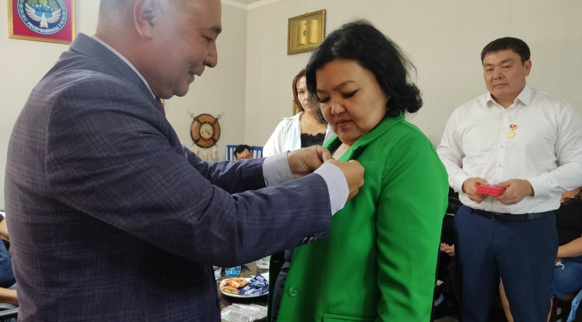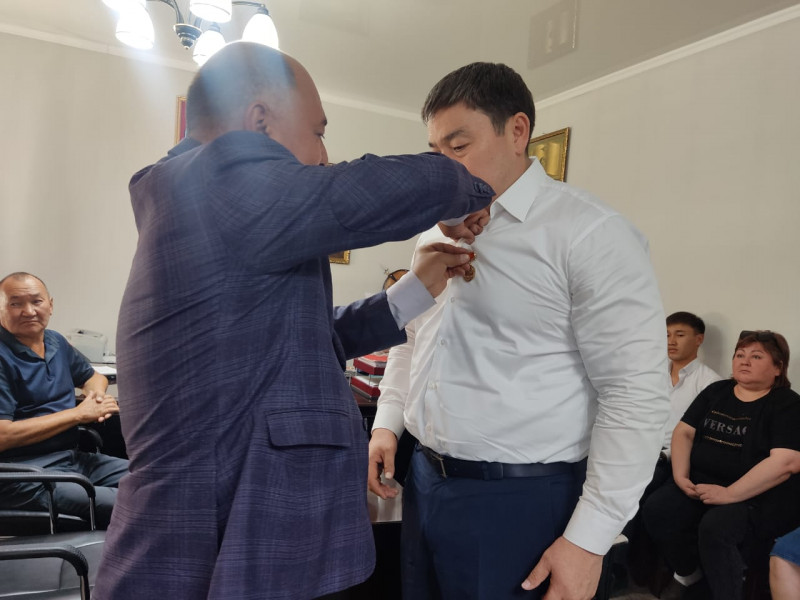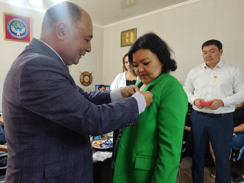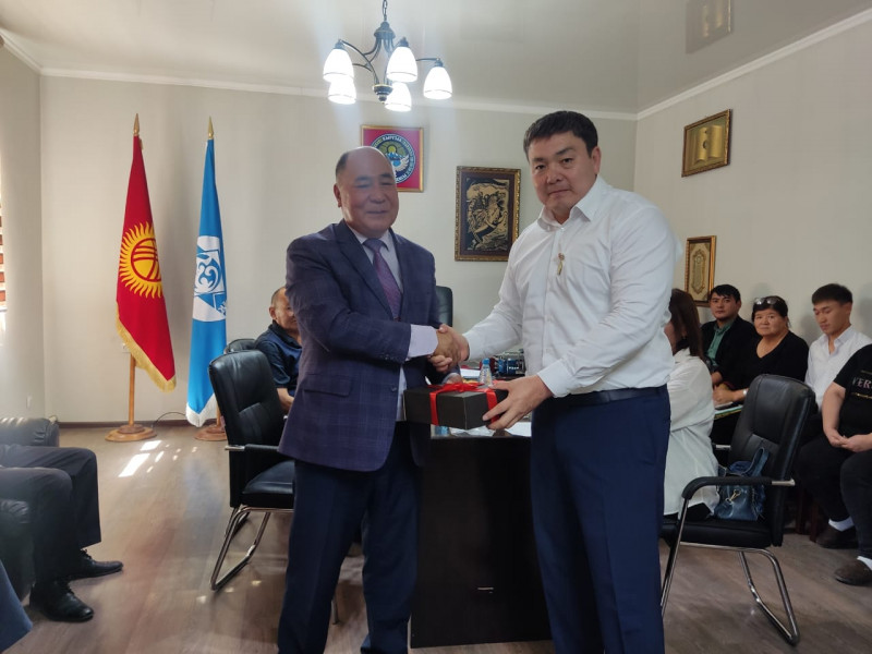 «Кыргыз тили коомунун» төрагасы кыргыз тилинин өнүгүшүнө кошкон салымы үчүн башкармалыктын жамаатына ыраазычылык билдирип, сыйлыкты тапшырды.