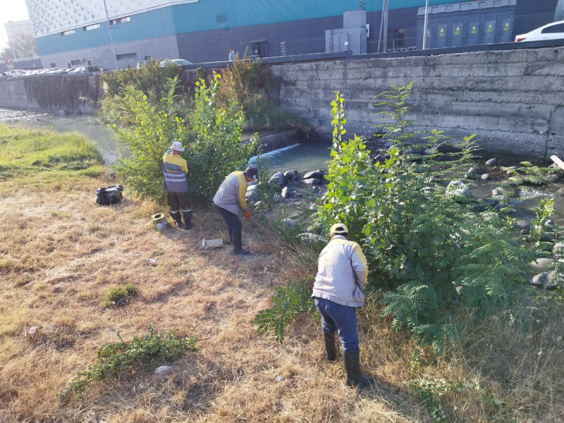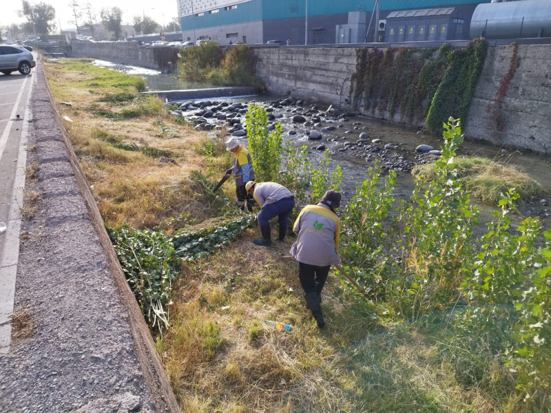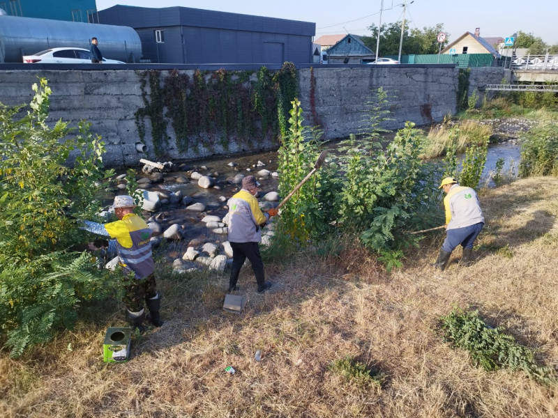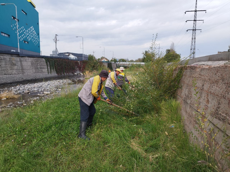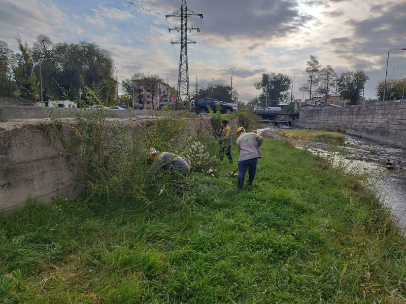 «Бишкексуучарба» муниципалдык ишканасынын кызматкерлери Ала-Арча дарыясынын нугун кол менен, ал эми ЧЧК каналын механикалаштырылган тазалоонун жардамы тазалоодо.