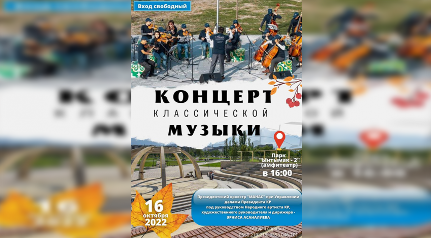 16-октябрда саат 16:00дө “Ынтымак-2” сейил багынын амфитеатрында КРсынын Президентинин Иш башкармалыгынын алдындагы “Манас” Президенттик оркестринин классикалык музыкасынын концерти өтөт.