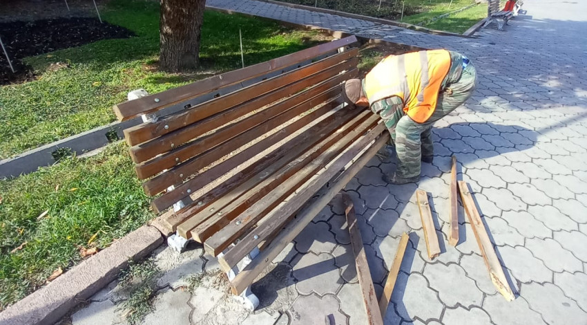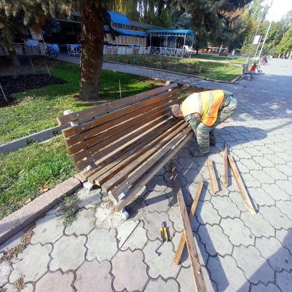 Тазалык кызматчылары 5 отургучту оңдоп, 15 таштанды челектерин сырдап, эстеликтердин сынган гранит плиталарын алмаштырышты.