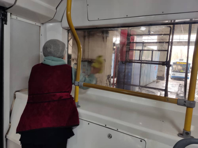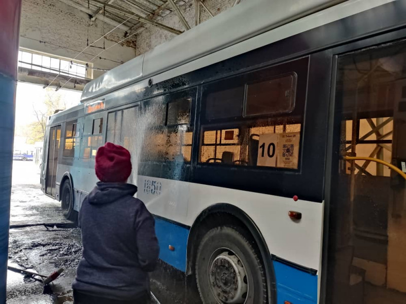 Тазалоочу топ күн сайын троллейбустардын ичин тазалап, жуушат. Орундар, терезелер, полдор тазаланган. Андан тышкары унаа токтотуучу жайда атайын унаа жуучу жай бар.