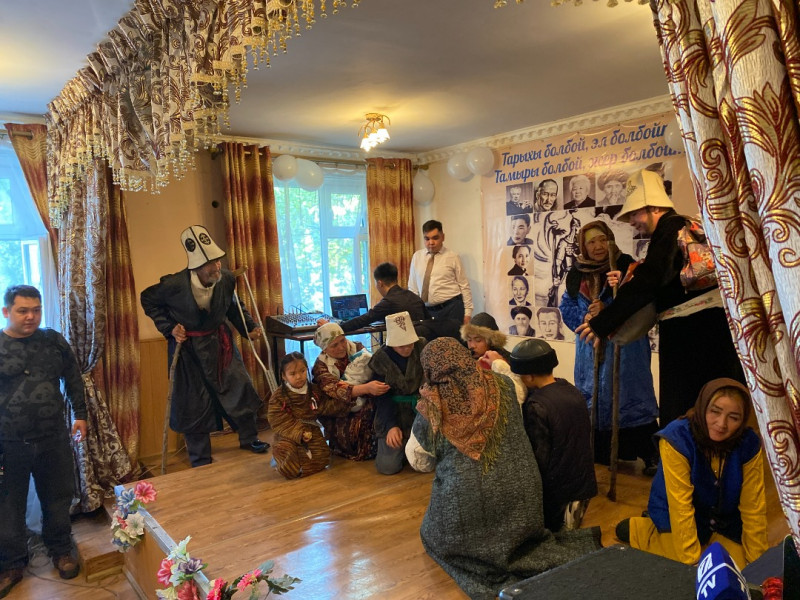 Келген коноктор жана мекеменин кызматкерлери меймандарга кыргыз мамлекеттүүлүгүнүн калыптануу тарыхын камтыган театрлаштырылган көрсөтүү даярдашты.