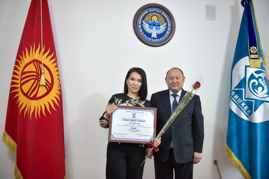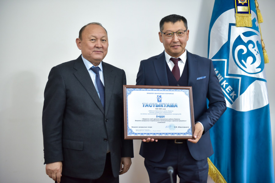 “Бишкек шаарынын мэриясынын мыкты муниципалдык аймактык башкармалыгы” сынагында 1-орунду Бишкек шаарынын мэриясынын №9 муниципалдык аймактык башкармалыгы ээледи. Аларга 100 миң сомдук сертификат тапшырылды.