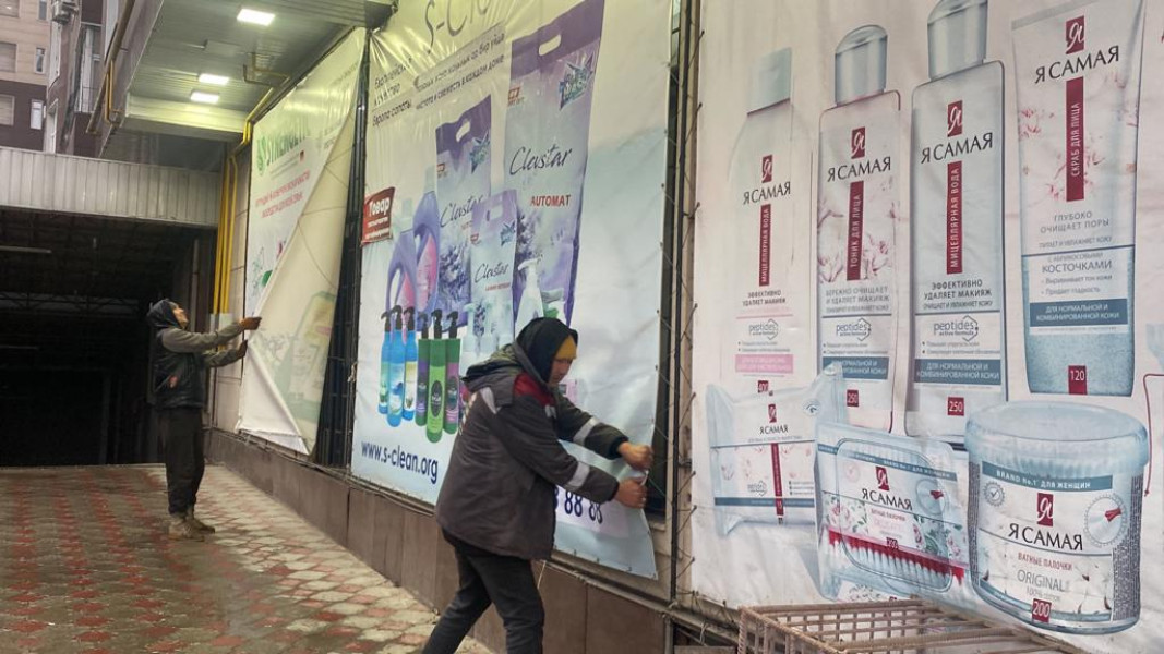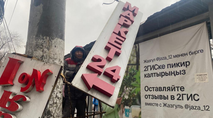 Октябрь районунда Бишкек шаарынын вице-мэри Нурдан Орунтаевдин жетекчилигинин алдында жарнамалык конструкциялар алынууда.