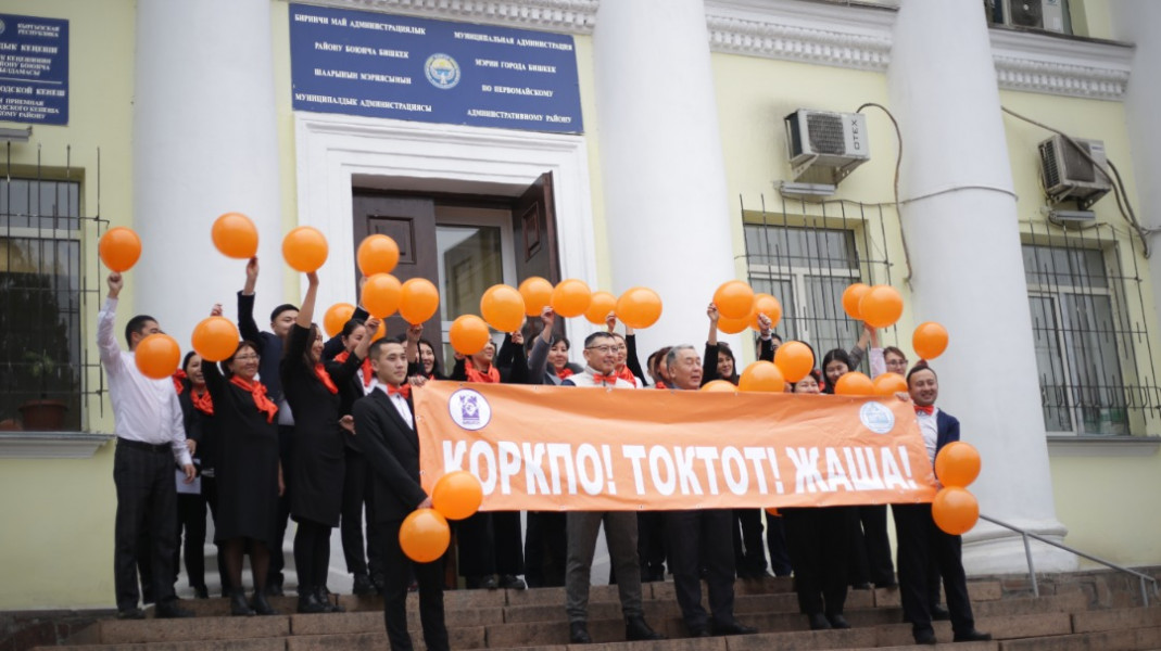 Биринчи май акимчилигинин кызматкерлери гендердик зомбулукка каршы 16 күндүк акцияны колдоо максатында кызгылт сары флешмоб өткөрүштү.