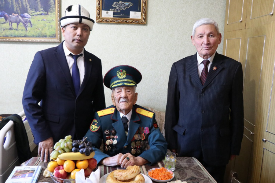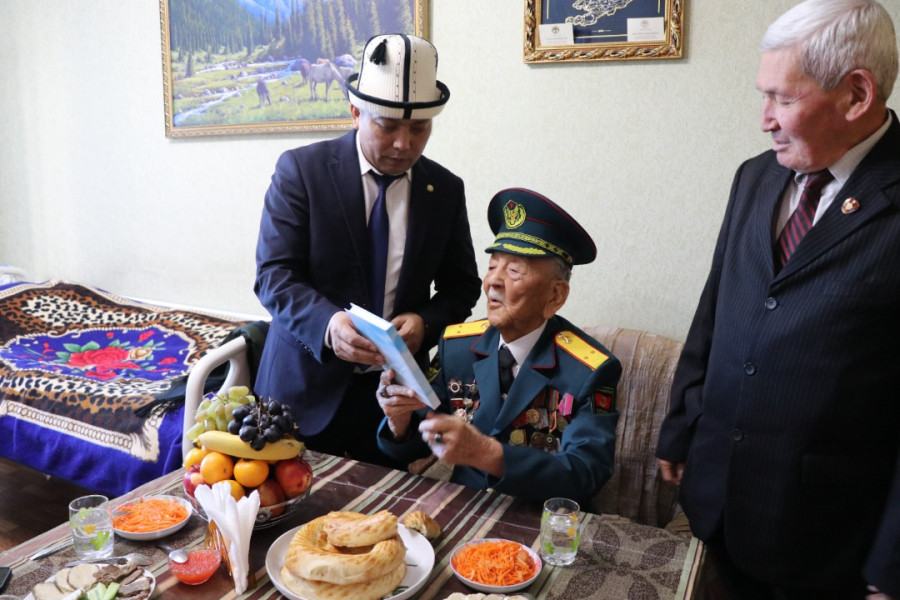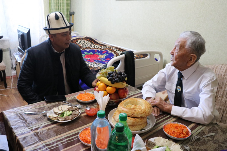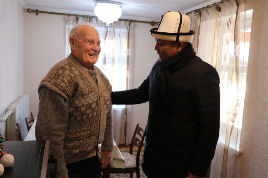 Ошондой эле аким 96 жаштагы Улуу Ата Мекендик согуштун ардагери Абдулхалик Гайсинге барды. Ардагерге материалдык жардам жана белектер тапшырылды.
