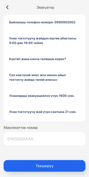 Колдонуучу «Эвакуация» бөлүмүнө кирип, автоунаасынын мамлекеттик номерин терет. Эгерде автоунаа эвакуацияланган болсо, тиркеме анын учурдагы жайгашкан жерин жана токтотулган атайын аянттын дарегин картадан көрсөтөт.