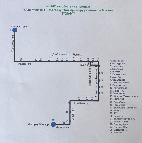 2025-жылдын 1-октябрынан тартып №14Т автобустук каттамдын кыймыл-чиймеси убактылуу өзгөртүлдү. Бул чечим тургундардын кайрылуулары жана суранычтарынын негизинде кабыл алынды.