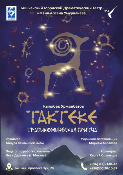 Бишкек шаарынын мэриясынын Маданият башкармалыгына караштуу А. Умуралиев атындагы Бишкек шаардык драма театрында 16 жана 17-октябрда саат 19:00дө эл акыны Кыялбек Урманбетовдун чыгармасынын негизинде коюлган «Тактеке» аттуу трагикомикалык притчанын премьерасы болот.