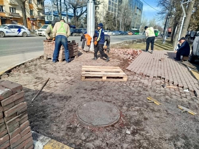 "Бишкекасфальтсервис" муниципалдык ишканасы Манас проспектиси бойлой жайгашкан коопсуздук аралчаларына брусчатка төшөө иштерин жүргүзүүдө. Бул иштер жөө жүргүнчүлөр үчүн жолдон өтүүнү ыңгайлуу жана коопсуз кылууга багытталган.