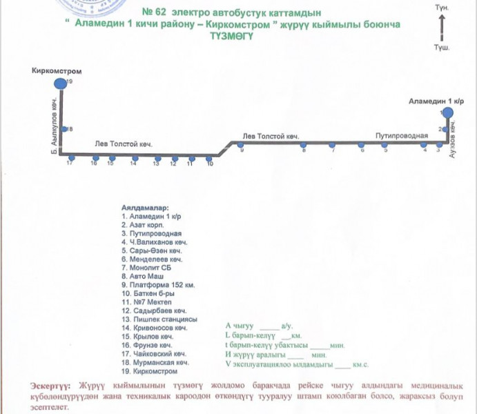 Бишкек шаарында 2026-жылдын 3-мартынан тартып жаңы №62 маршруттук каттам ишке киргизилүүдө.
