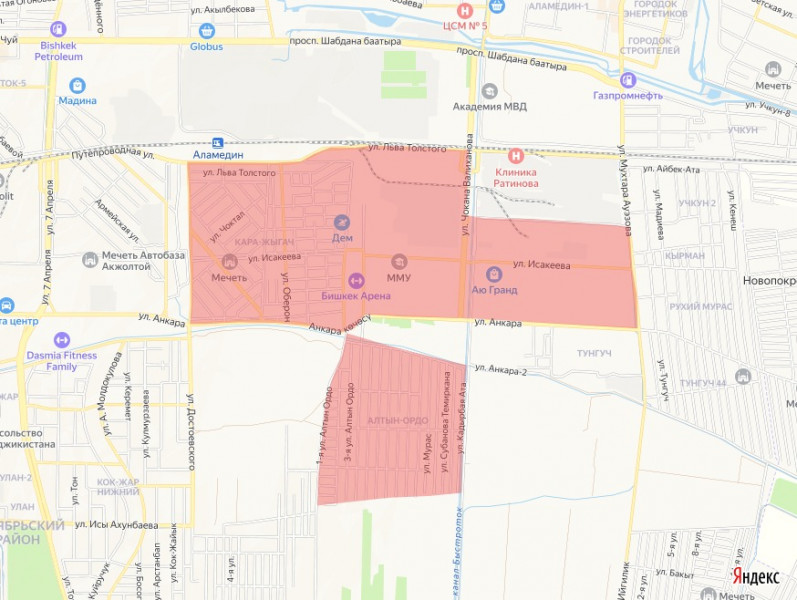 Өчүрүү аймагы: Достоевский көчөсү - Анкара көчөсү - Ауэзов көчөсү – темир жол. Ошондой эле Алтын Ордо, Кара-Жыгач жана Полиция шаарчасы конуштары.