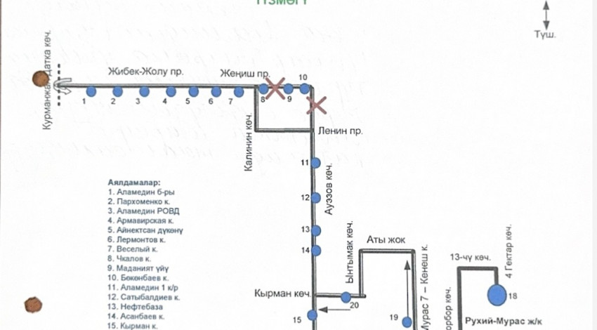 Буга чейин аталган маршрут Осмонкул, Күрөңкеев, Баялинов көчөлөрү аркылуу өтүп, Жаш Гвардия бульварын, Жибек Жолу проспектисин, ошондой эле Кулиев, Рыскулов, Фучик жана Коммунаров көчөлөрүн камтып келген.