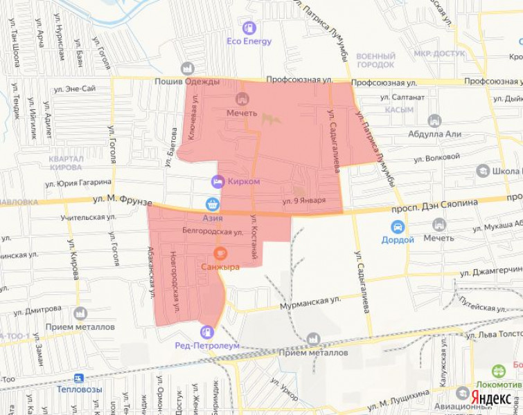 Суу өчүрүлө турган аймак төмөнкү көчөлөр менен чектелет: