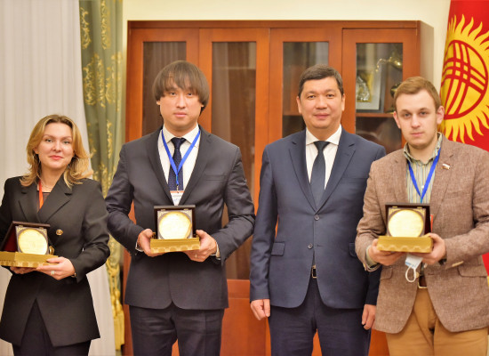 Бишкек шаарынын мэри Айбек Жунушалиев Мамлекеттик Думанын депутаттары Сангаджи Тарбаев жана Василий Власов менен жолукту