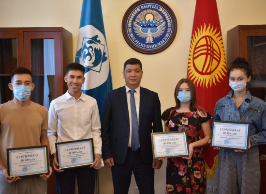 Бишкек шаарынын мэри Айбек Жунушалиев Россиянын ЖОЖдорунун бирине өткөн жетим балдарга сертификаттарды тапшырды