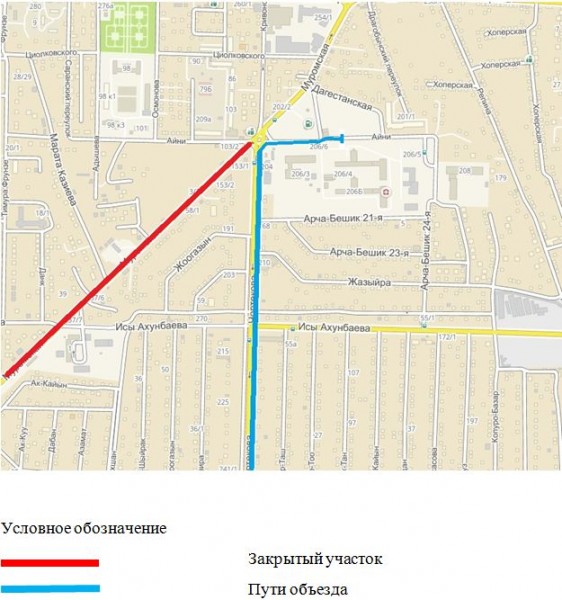 На время проведения работ конечная будет организована на улице Айни, рядом с Бишкекской городской больницей №4. Движение будет осуществляться по улицам: Айни, Чортекова и далее по своей схеме движения.