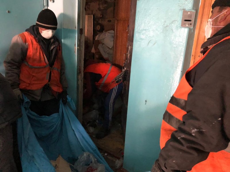Сотрудники МП «Тазалык» второй день подряд продолжают вывозить мусор, на данный момент доступ к батареям все еще закрыт. Работы ведутся непрерывно. Для освобождения квартиры понадобится около 10 рейсов.