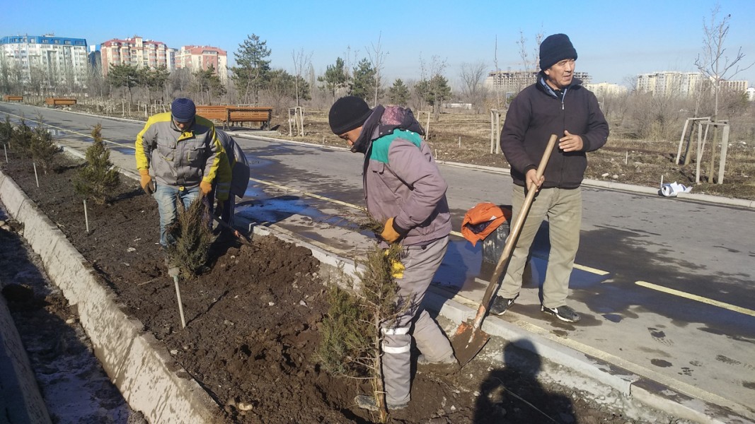 МП "Бишкекзеленхоз продолжает зимние посадки хвойных пород молодых деревьев.