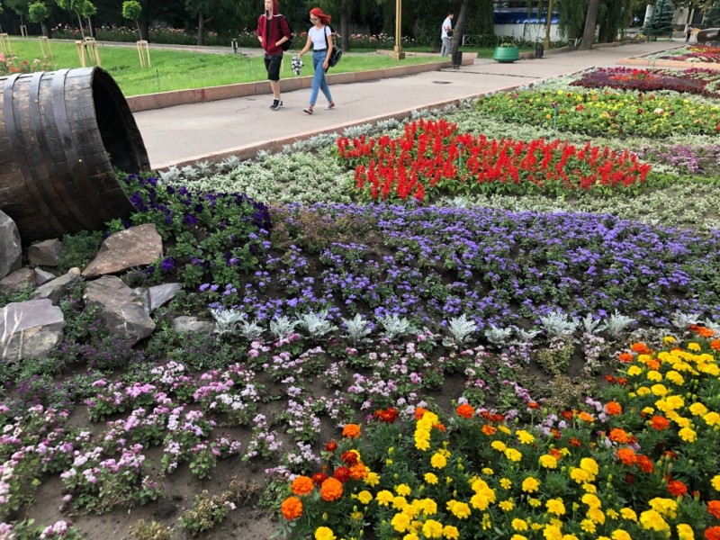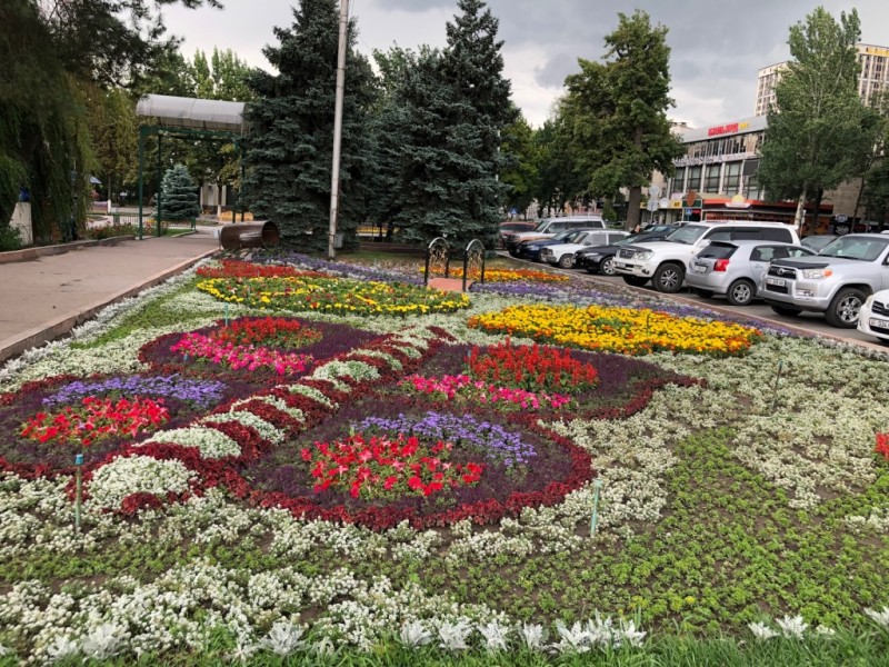 Цветочная композиция в виде часов, которая показывает точное бишкекское время, а также цветочные клумбы в виде бабочек и ручейка теперь радуют горожан и гостей столицы.