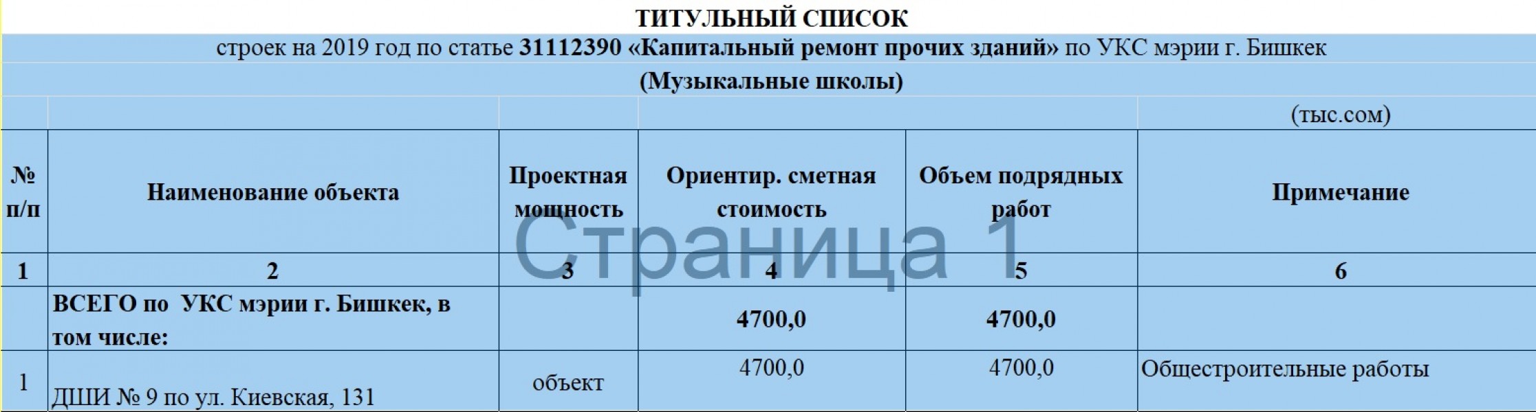 ТИТУЛЬНЫЙ СПИСОК СТРОЕК НА 2019 ГОД ПО СТАТЬЕ 31112390 "КАПИТАЛЬНЫЙ РЕМОНТ ПРОЧИХ ЗДАНИЙ" ПО УКС МЭРИИ г. БИШКЕК (МУЗЫКАЛЬНЫЕ ШКОЛЫ)