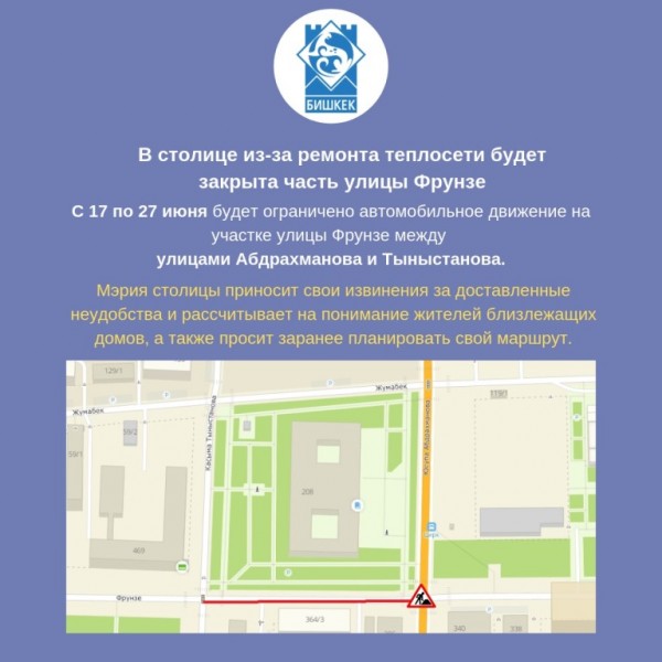 С 17 по 27 июня будет ограничено автомобильное движение на участке улицы Фрунзе между улицами Абдрахманова и Тыныстанова.