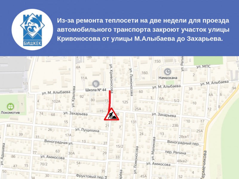 В Бишкеке на две недели для проезда автомобильного транспорта закроют участок улицы Кривоносова от улицы М.Алыбаева до Захарьева.