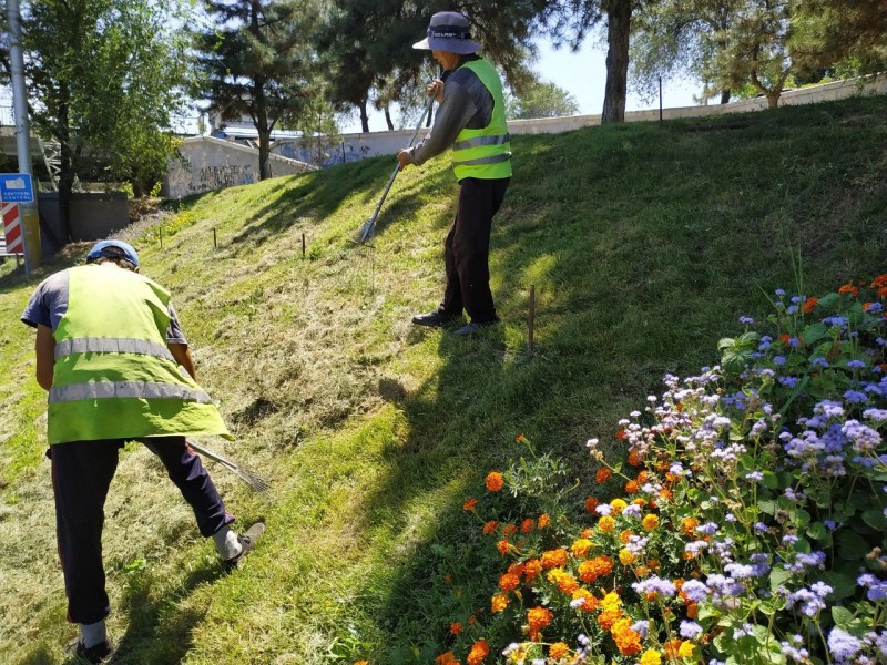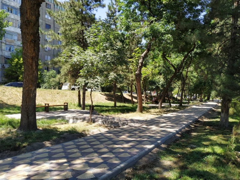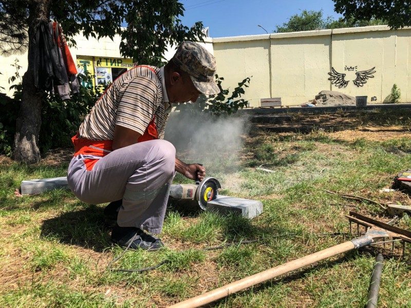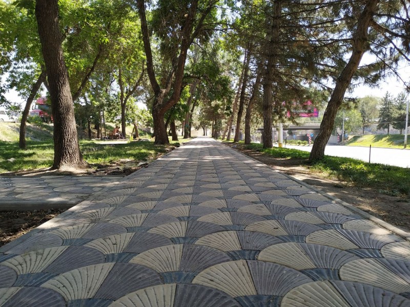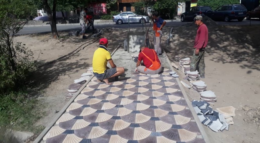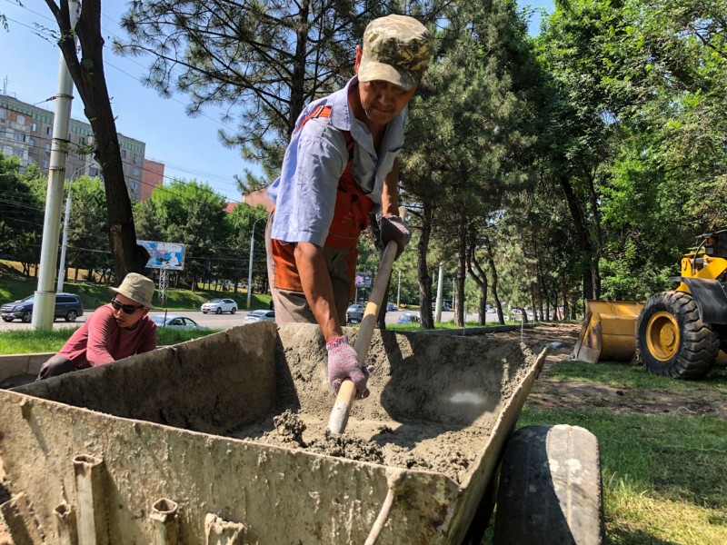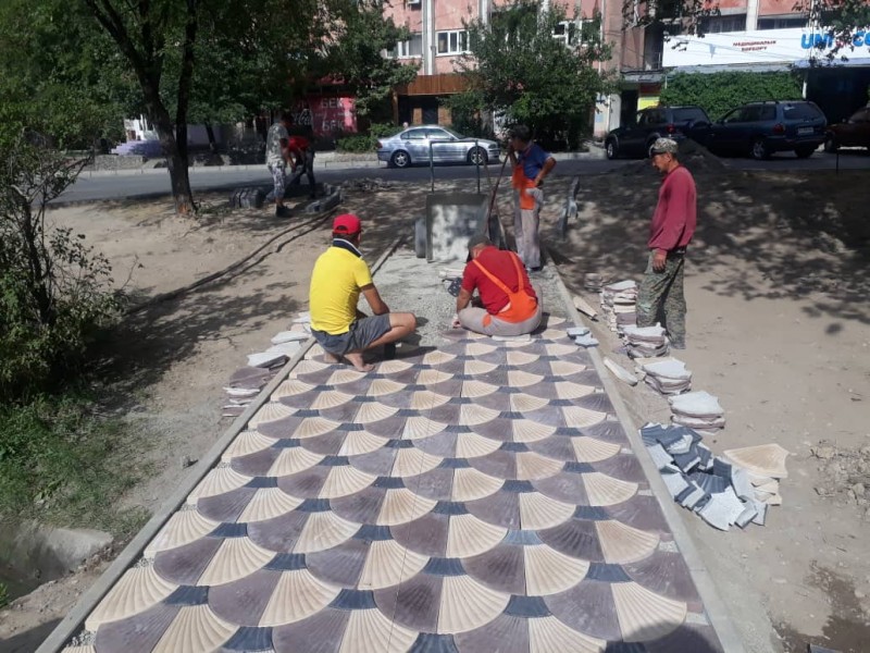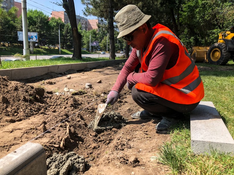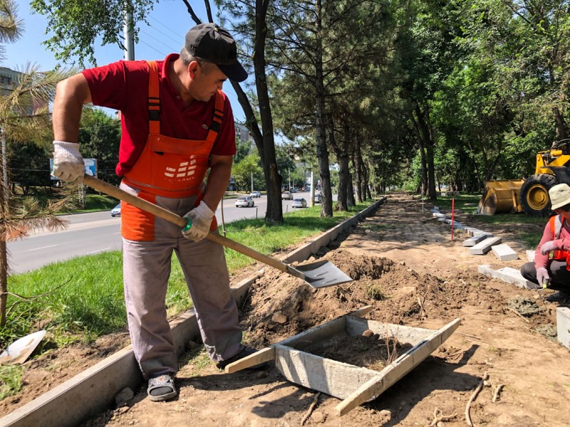 Сейчас работы по благоустройству нового места для отдыха проводятся на пересечении улиц Боконбаева и Ибраимова рядом с путепроводом. Сотрудники МП "Тазалык" укладывают брусчатку, устанавливают скамейки и урны, которые были изготовлены рабочими на базе предприятия.