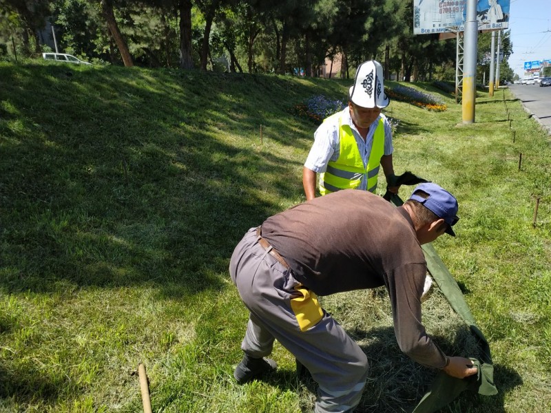 МП "Бишкекзеленхоз" на этом же месте сажает новый газон. На данный момент рабочие уже произвели первую часть работы - подготовили землю и выровняли грунт. В ближайшие дни будет засеян сам газон.