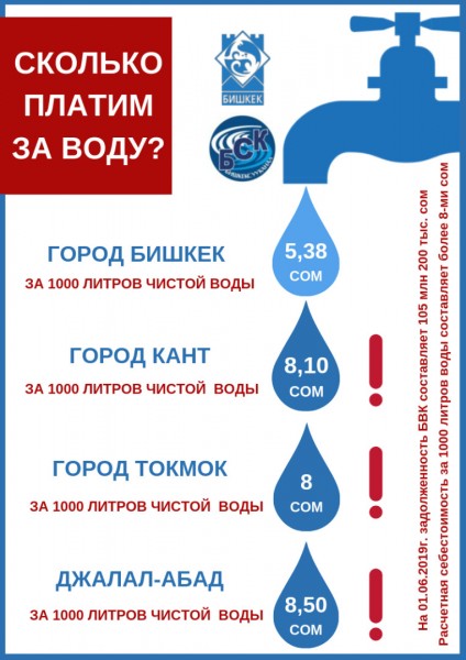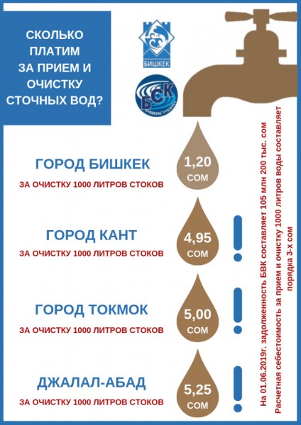 Сегодня тарифы для населения по водоснабжению утверждены в размере 5,38 сомов за 1000 литров чистой питьевой воды, когда как расчетная себестоимость 1000 литров воды составляет более 8-ми сомов! Тариф для населения приёма и очистки сточных вод утверждён в размере 1,20 сомов за 1000 литров очистки стоков, а расчетная себестоимость порядка 3-х сомов, что в разы ниже уровня тарифов в других городах и населенных пунктах нашей страны. К примеру, в приграничном с городом посёлке Лебединовка жители оплачивают 8, 20 сомов, а бюджетные организации 21 сом за тот же объём получаемой воды!