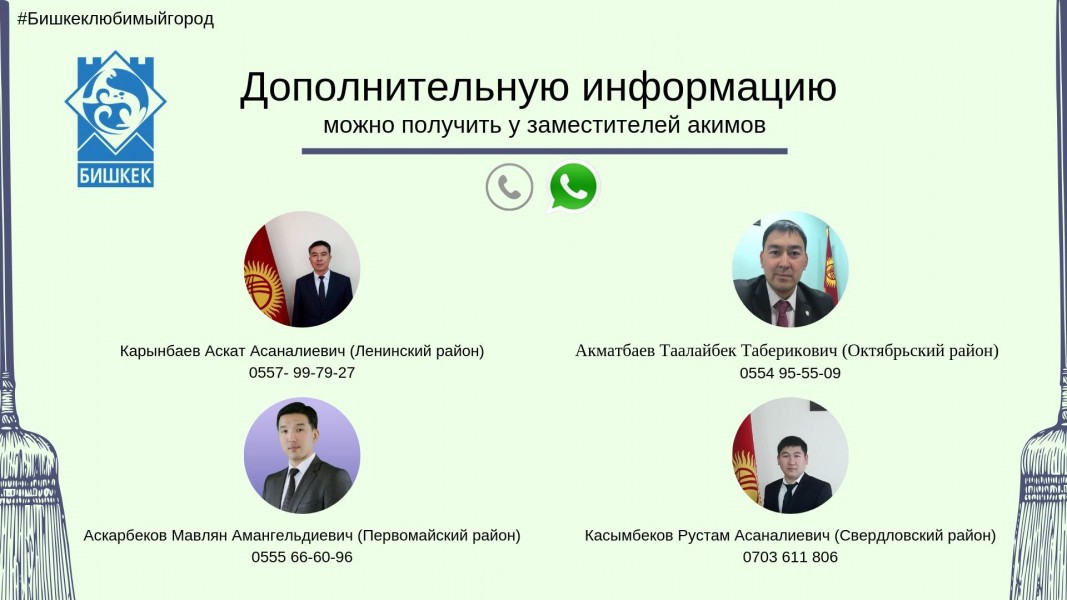 - Акматбаев Таалайбек Таберикович (Октябрьский район) — 0554 95-55-09;