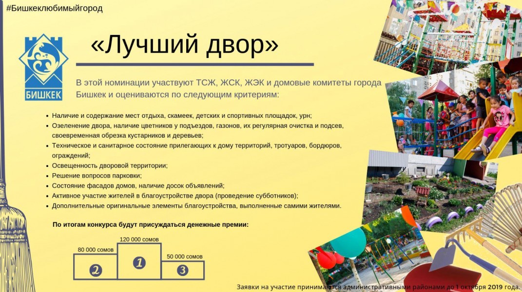 В номинации «Лучший двор» могут принять участие ТСЖ, ЖСК, ЖЭК и домовые комитеты города Бишкек. По итогам конкурса будут присуждаться денежные премии: 1 место – 120 тысяч сомов, 2 место – 80 тысяч сомов и 3 место – 50 тысяч сомов.