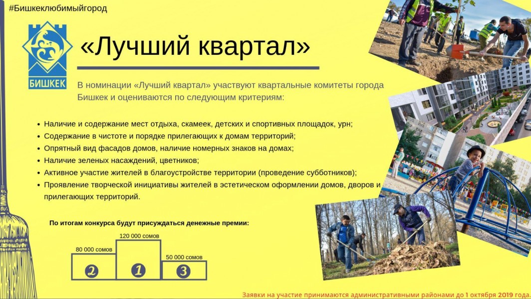 В номинации «Лучший квартал» могут принять участие квартальные комитеты города. По этой номинации также будут присуждаться денежные премии: 1 место – 120 тысяч сомов, 2 место – 80 тысяч сомов, 3 место – 50 тысяч сомов.