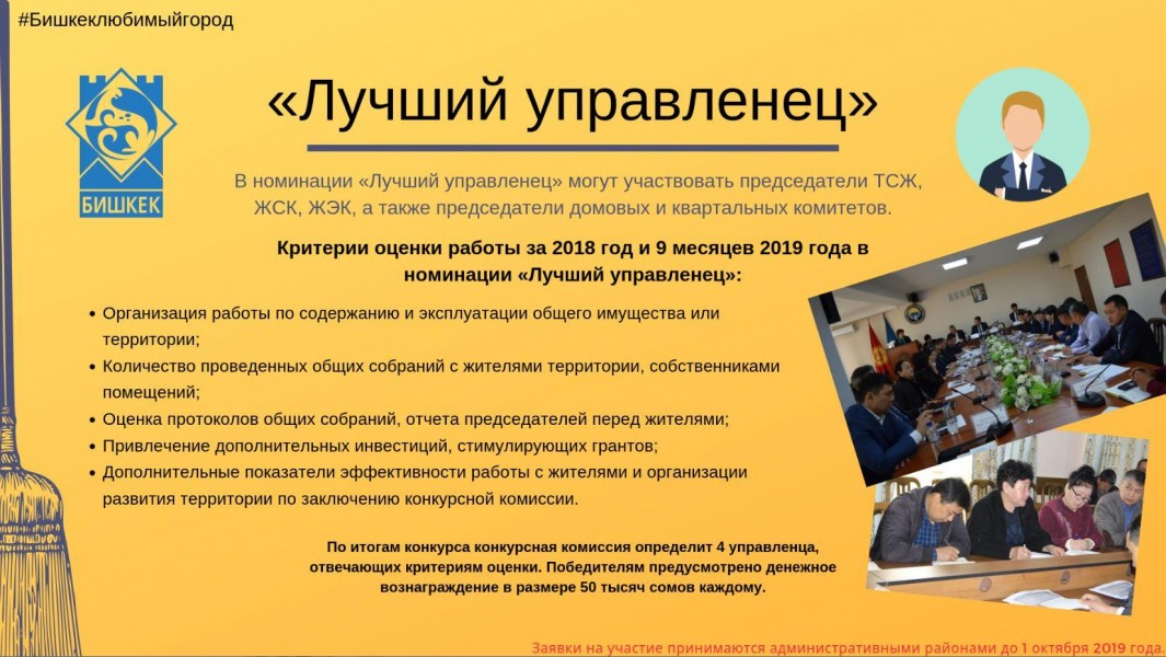 В номинации «Лучший управленец» могут участвовать председатели ТСЖ, ЖСК, ЖЭК, а также председатели домовых и квартальных комитетов. По итогам конкурса конкурсная комиссия определит 4 управленца, отвечающих критериям оценки. Победителям предусмотрено денежное вознаграждение в размере 50 тысяч сомов каждому.