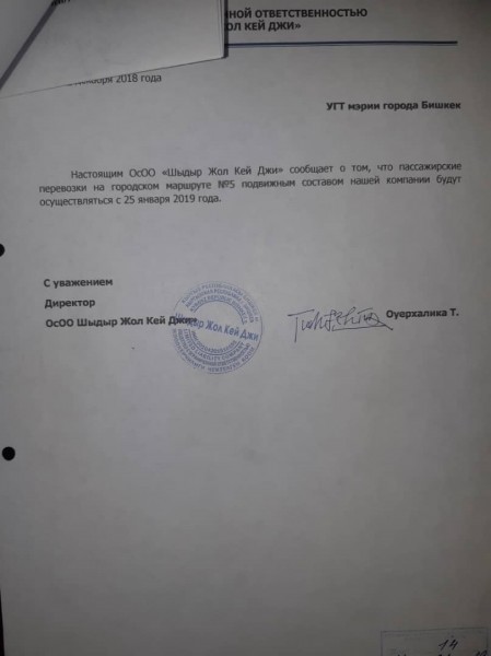 Управление городского транспорта прекратило договорные отношения «О праве временного пользования муниципальным маршрутом №5» с компанией «Шыдыр Жол Кей Джи» по причине нарушения с их стороны договорных обязательств.