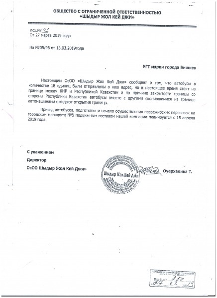 По этой причине управление городского транспорта уже направило письмо в УОБДД по городу Бишкек с просьбой оказать содействие в недопущении выезда данных автобусов по маршруту №5.