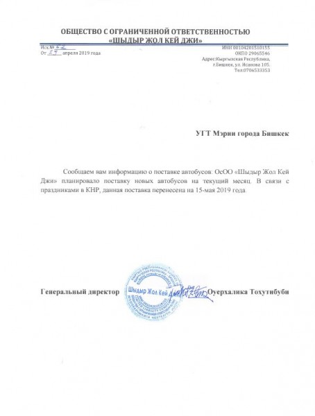 Так, «Шыдыр Жол Кей Джи» обязалось начать пассажирские перевозки с 25 января текущего года. Однако компания три раза переносила дату выхода на линию автобусов. В последний раз ими было заявлено, что в связи с праздниками в КНР поставка транспорта перенесена на 15 мая 2019 года. При этом транспорт прибыл в город только к середине июля.