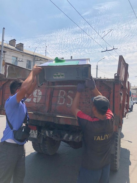 Справка: Статья 120. Нарушение правил охраны полосы отвода автомобильных дорог. Распашка участка, порубка или повреждение насаждений, снятие дерна или выемка грунта, самовольное строительство подъездных путей или разрыв разделительной полосы, спуск канализационных, промышленных, мелиоративных и сточных вод в водоотводные сооружения и резервы на полосе отвода автомобильной дороги, создание препятствий на дороге, улице, сооружение или организация в придорожной полосе торговых точек, пунктов питания, сервиса или рекламных щитов, панно, афиш, транспарантов, вывесок, плакатов, знаков, указателей без согласования с соответствующими органами влекут наложение штрафа 2 категории: для физических лиц - 3 тысячи сомов, для юридических лиц – 13 тысяч сомов.
