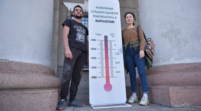 В рамках проекта в Бишкеке установлено 4 "градусника", которые показывают как менялась среднегодовая температура с 1960 года и какой прирост ожидается, если ничего не предпринимать сейчас. К сожалению, в Кыргызстане к концу века рост температуры может составить от 4С до 6С. Градусники установлены возле мэрии города Бишкек, на Южных воротах, на центральной площади Ала-Тоо и на территории торгового центра "ГУМ".