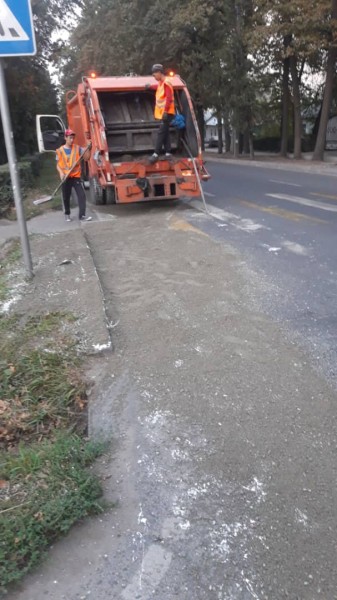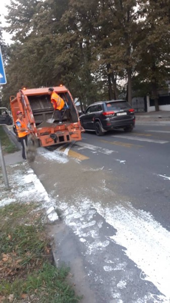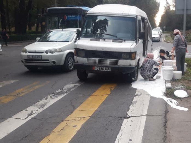 Как выяснилось, в пятницу, 27 сентября, микроавтобус, в котором были ведра с белой краской, попал в сложную дорожную ситуацию и резко затормозил, вся краска вылилась на землю.