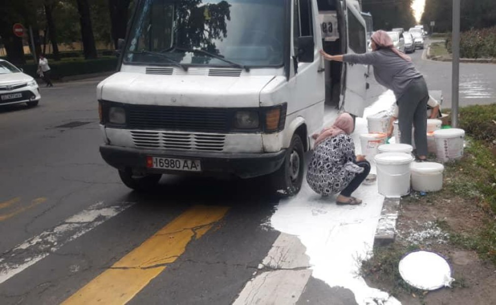 И вновь сотрудники муниципального предприятия «Тазалык» вычистили проезжую часть на перекрёстке ул. Жибек-Жолу и бул. Эркиндик от краски, пролитой горожанами.