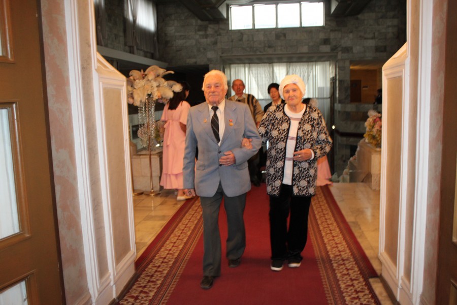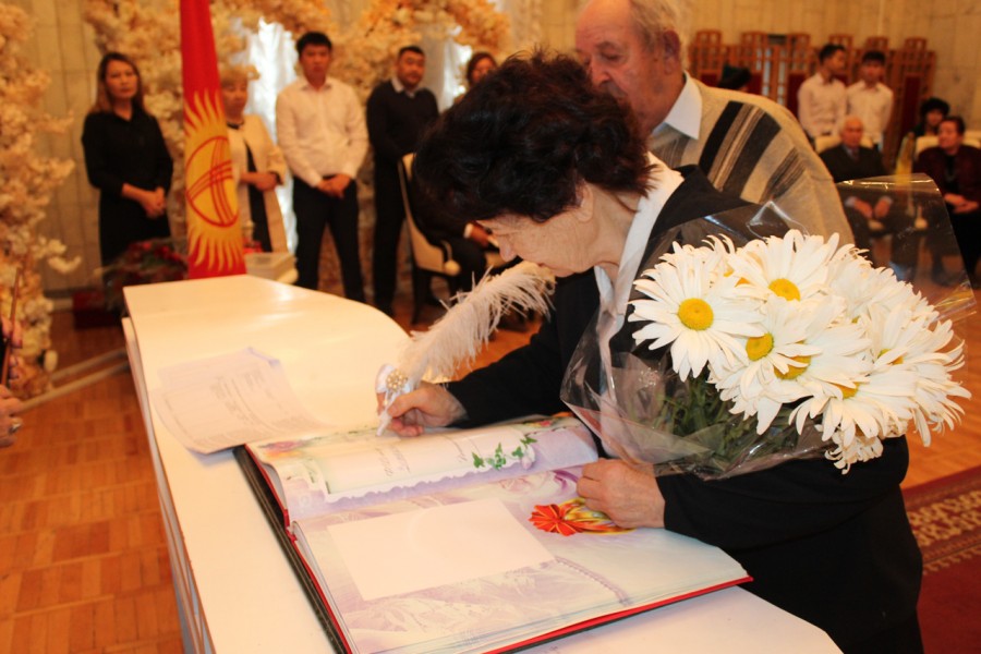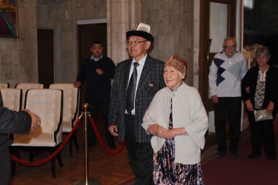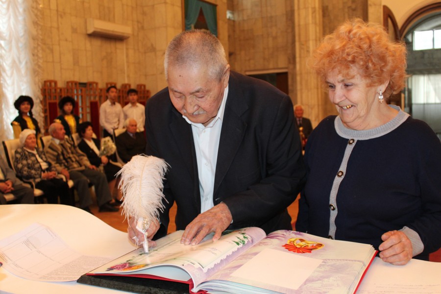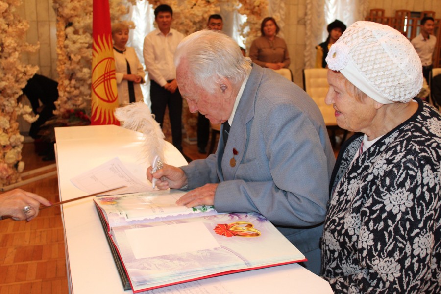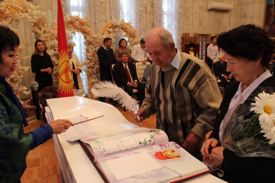 Накануне 20 пар Свердловского района заключили брак ровно 50, 55 и 60 лет назад. Аким района Мурат Осмонов поздравил юбиляров с годовщиной, вручил подарки.
