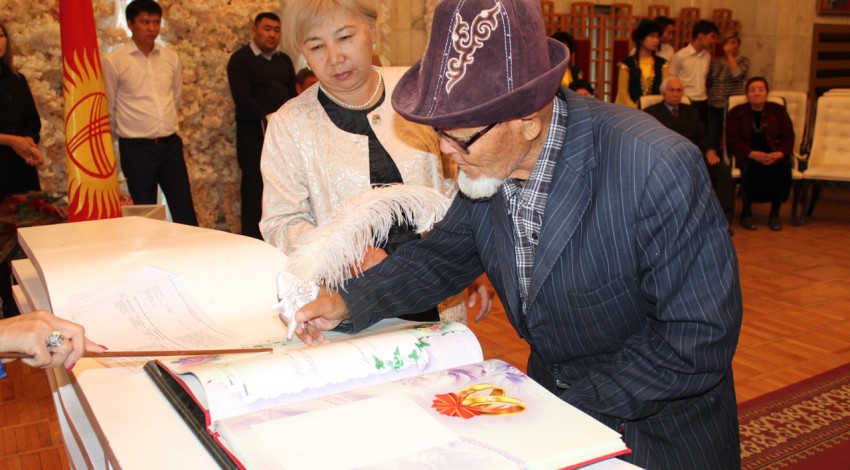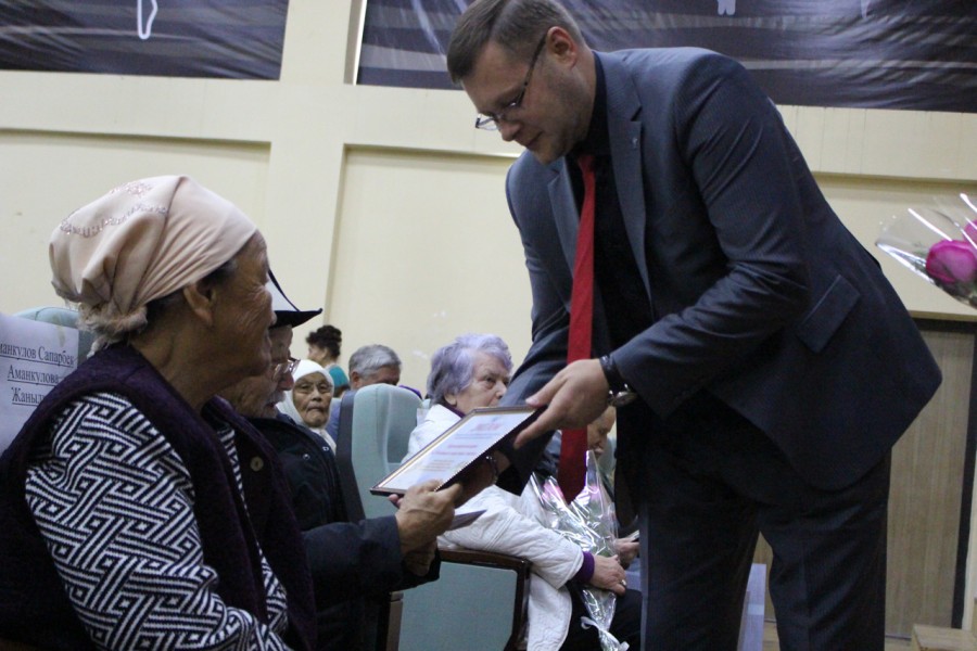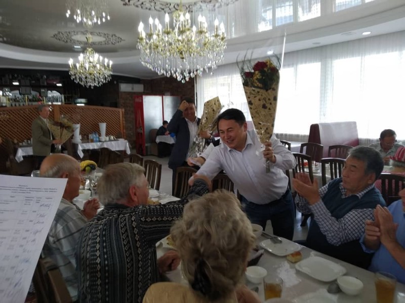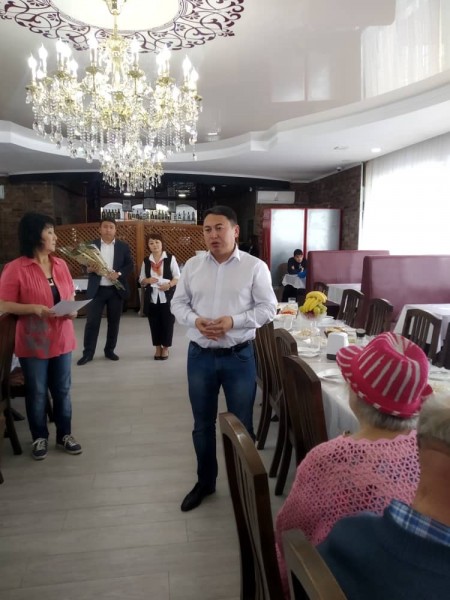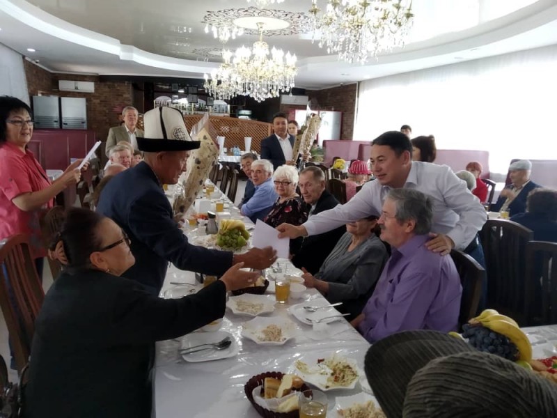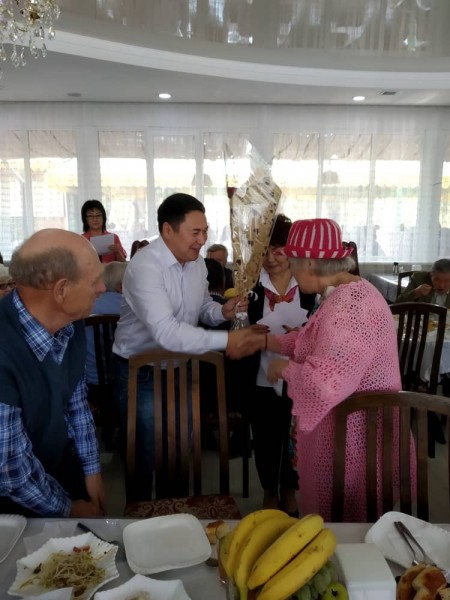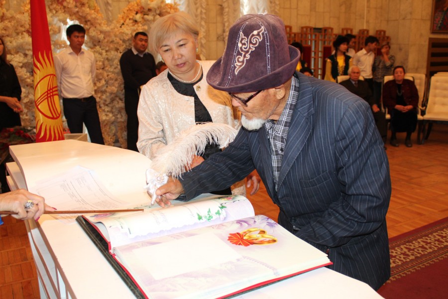 Накануне 20 пар Свердловского района заключили брак ровно 50, 55 и 60 лет назад. Аким района Мурат Осмонов поздравил юбиляров с годовщиной, вручил подарки.